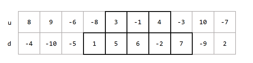 给定一个 2*n 的长方形网格,请从中找出一片凸型的区域,使得这片区域的分数之和达到最大。以下是一个例子,黑框表示分数最大的凸型区域: