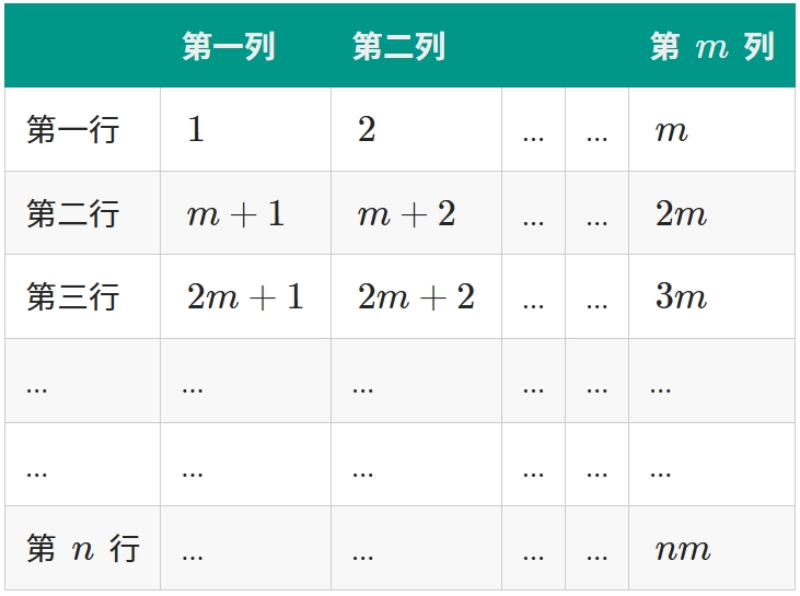 从 1 开始的 \( n × m \) 个整数按照先行后列的规律排列如下: